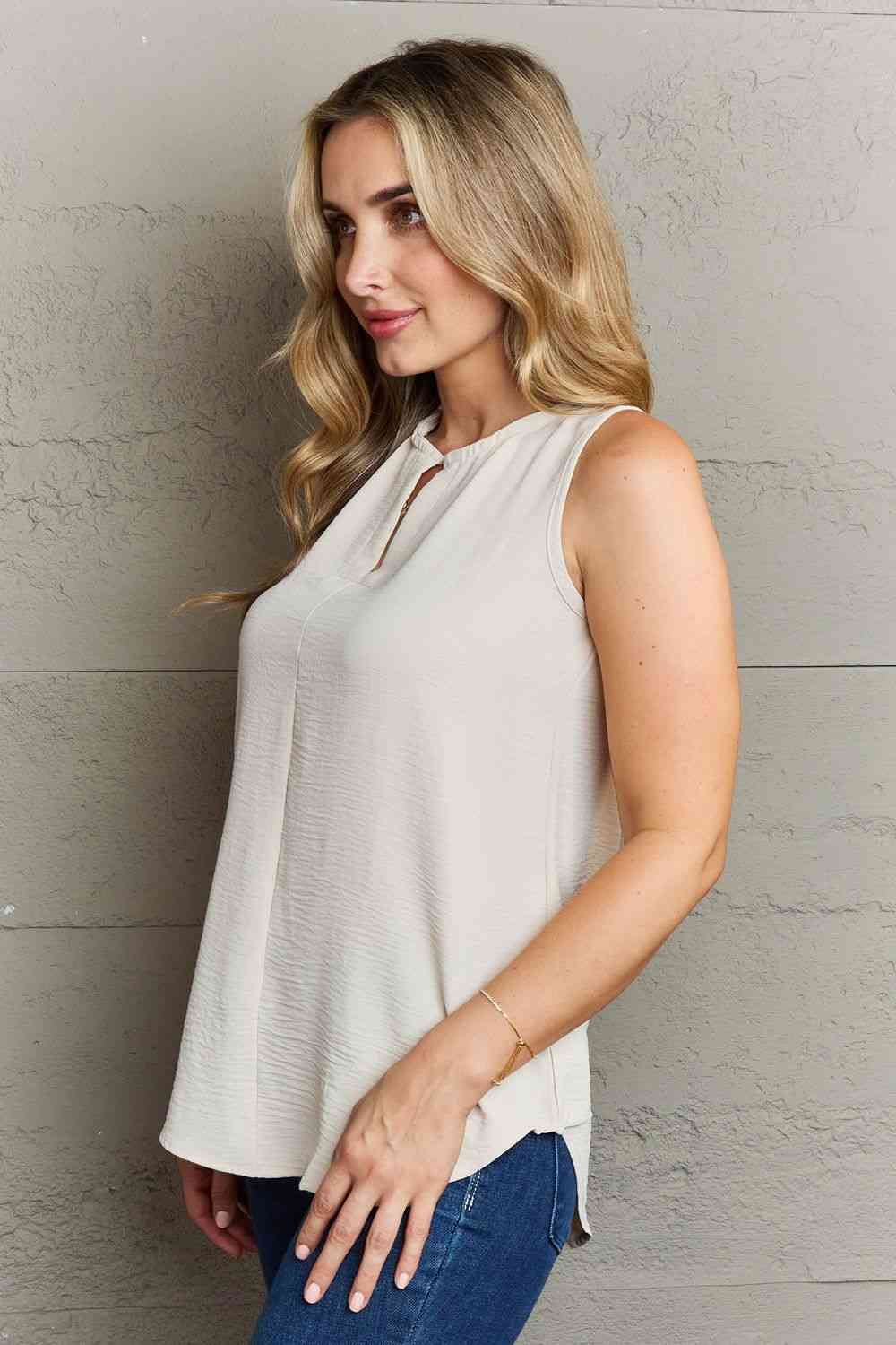 Another stylish element is the neckline slit detail. With a modest slit, it creates a subtle focal point, drawing attention to your neckline and collarbone. It adds a hint of allure and makes this top stand out from the crowd. It's a perfect balance between trendy and classy. The sleeveless design is perfect for warmer days, allowing you to stay cool and comfortable. The top's relaxed fit provides freedom of movement, ensuring you can go about your day with ease. Whether you're running errands, meeting friends for lunch, or enjoying a casual outing, this top will keep you looking effortlessly chic.