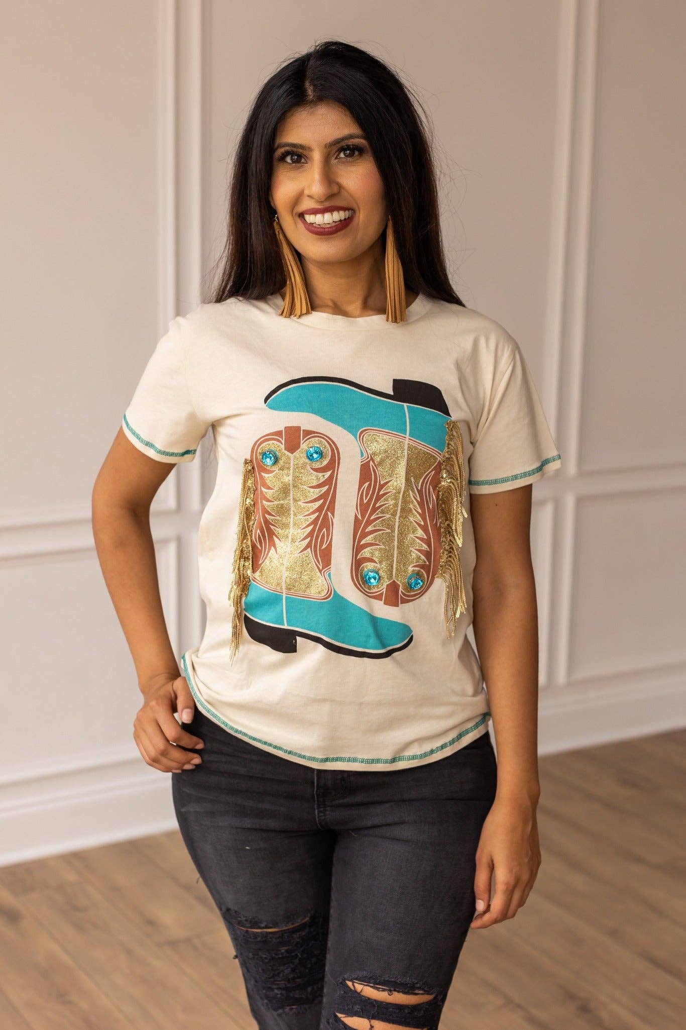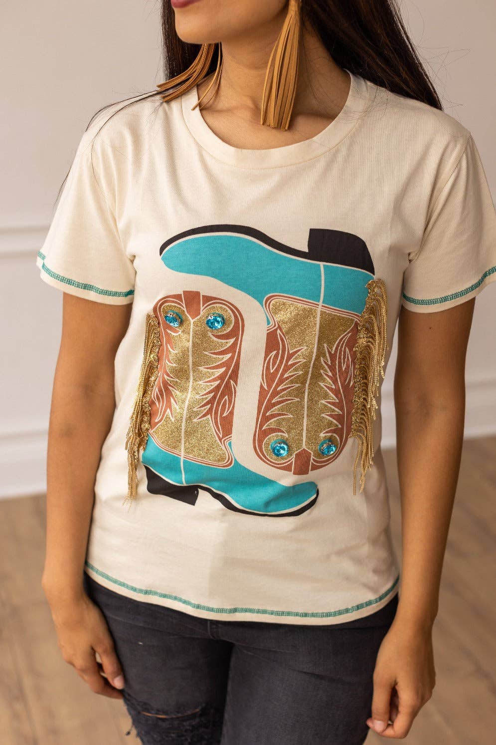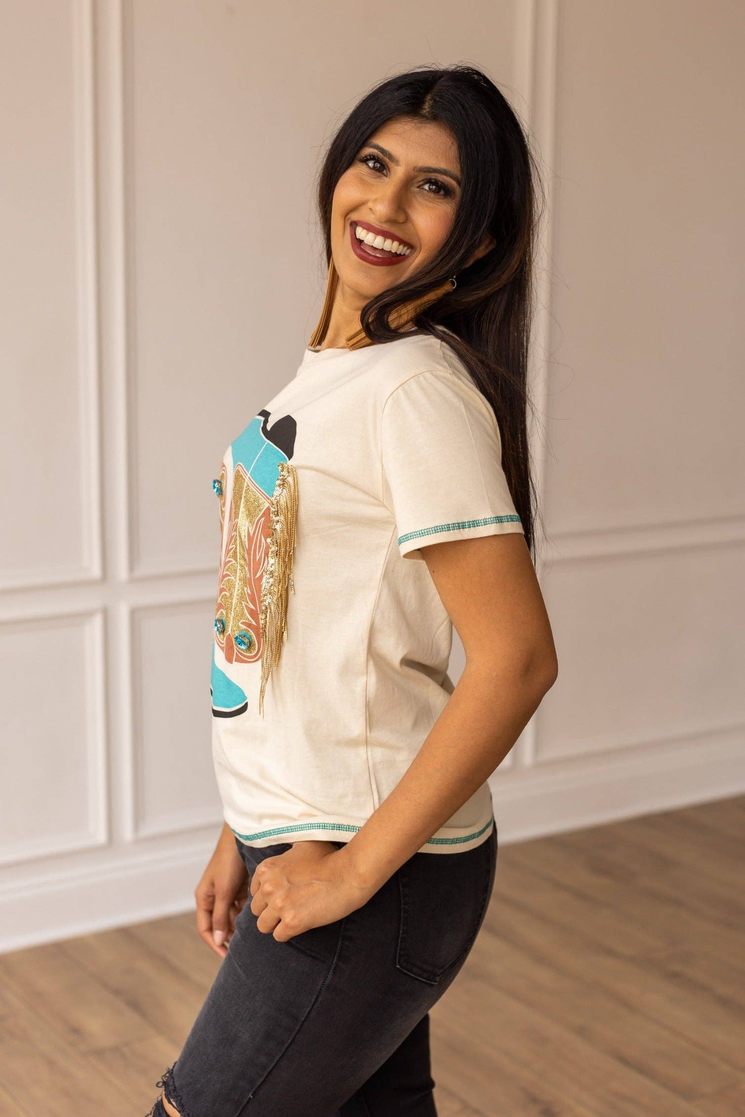 Show the world what you're made of with our Show Me Your Boots Tee! This fun and flirty top features a trendy beige color and eye-catching sequin fringe detailing, making it the perfect way to express yourself and your love of fashion. Whether you're running errands or heading out for a night on the town, this tee is sure to keep you looking and feeling great. So kick up your heels, throw on your favorite boots, and let the world know what you're all about with our Show Me Your Boots Tee!