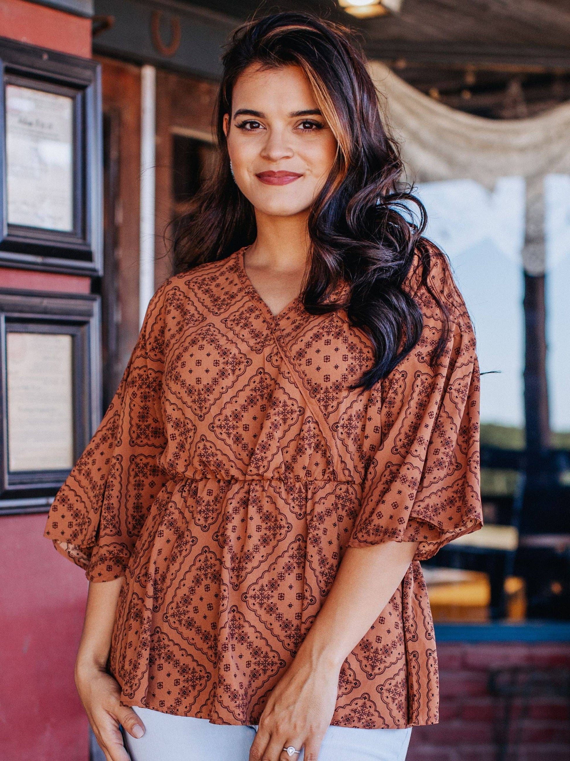 This ‘Southern Social' blouse will become a staple in your closet because it is super versatile. The style of this top is so classy, so you can dress it up with a black skirt and your favorite wedges. Plus the sleeve length and flowy fabric make it a transitional piece as well!