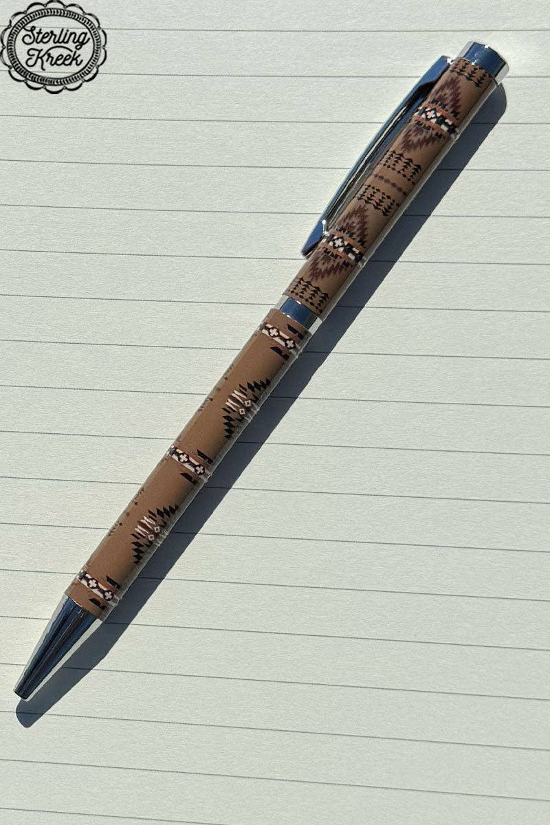 Unleash your inner adventurer with The Geronimo Pen. This quirky brown pen features an Aztec design that will transport you to primitive lands (figuratively, of course). Get ready to take on the world, one quirky note at a time.