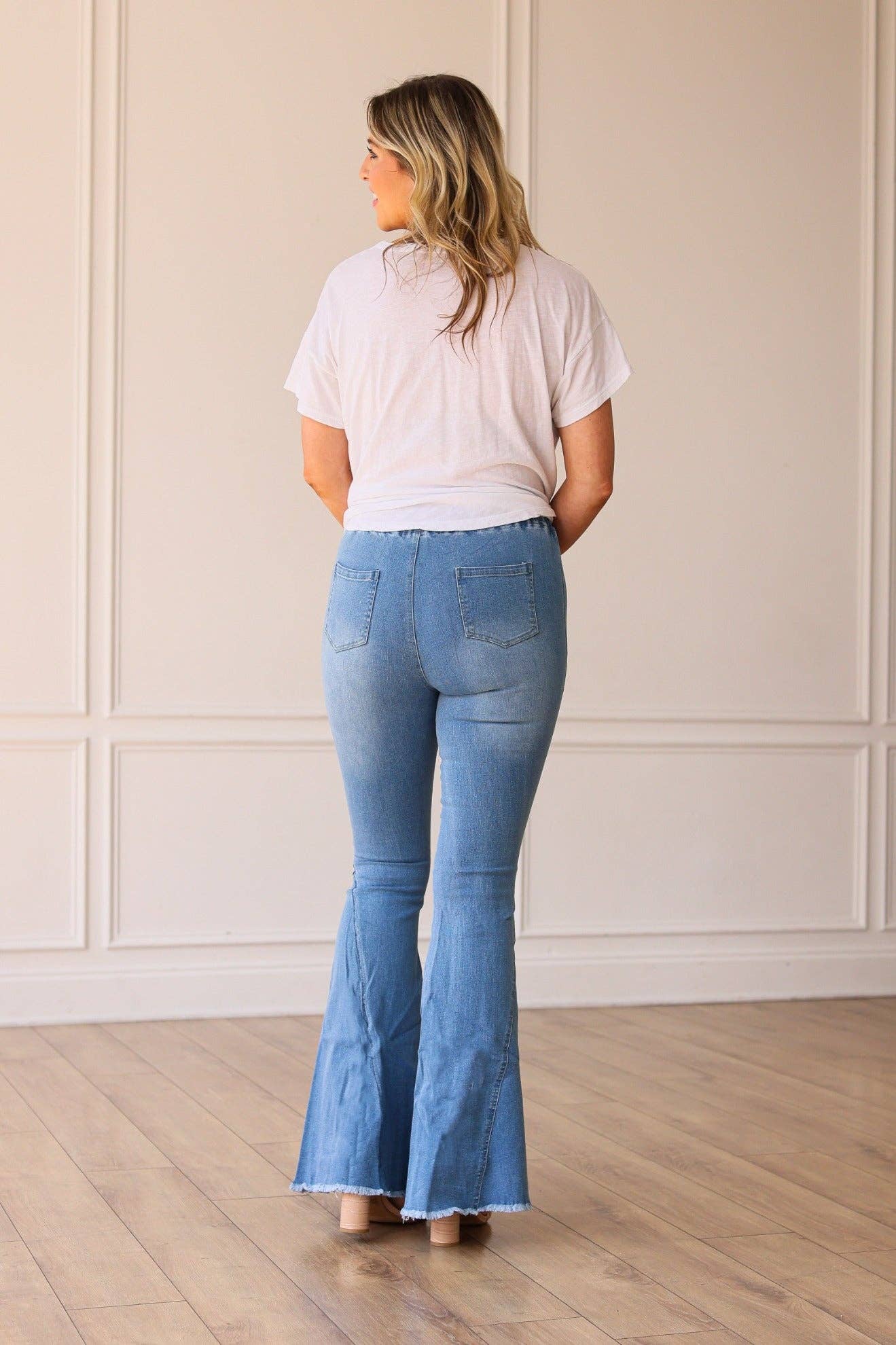 These flares are a closet staple! The exaggerated flare and the distressed hem make for a cool and casual look. Our elastic waist tailors the fit to you!