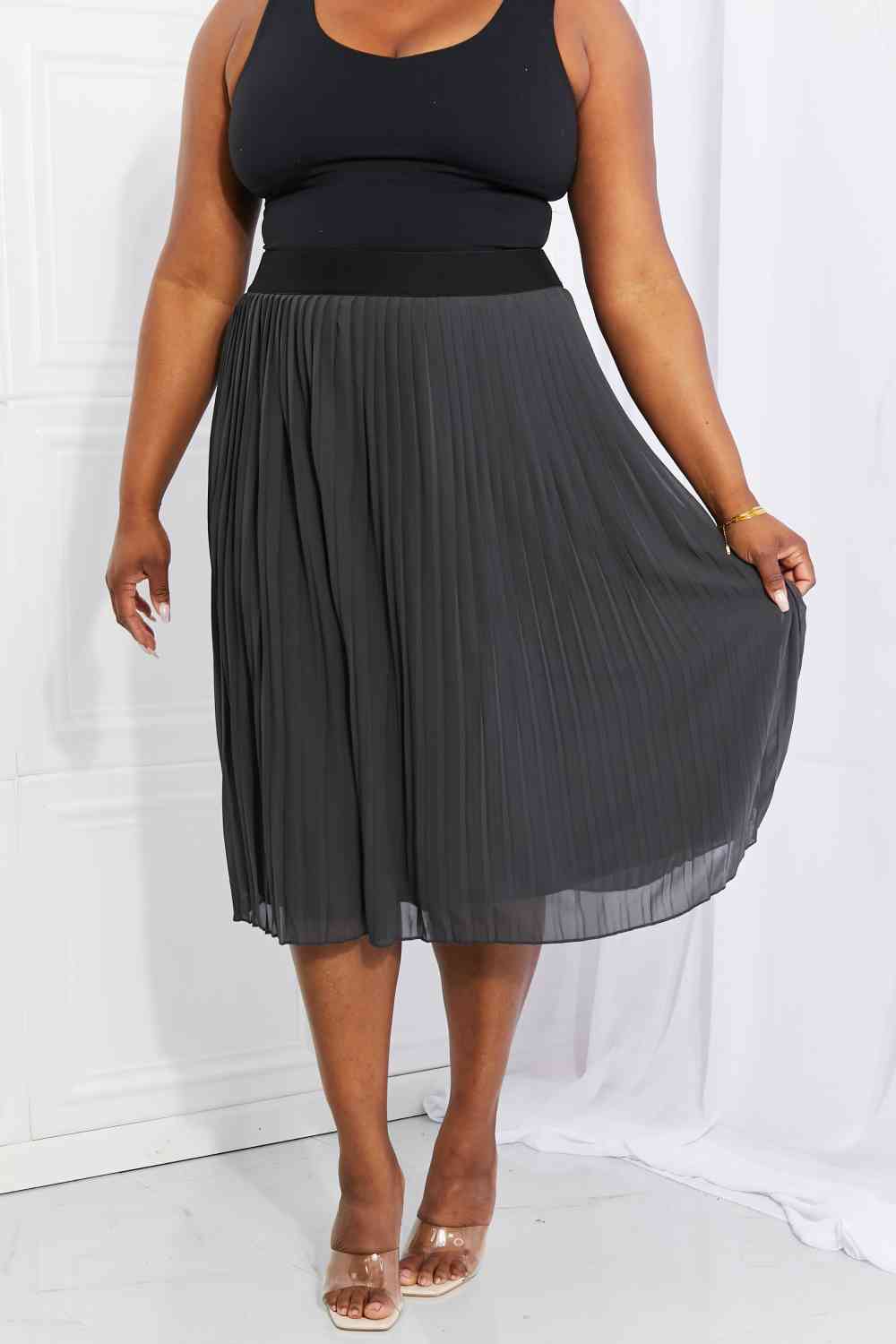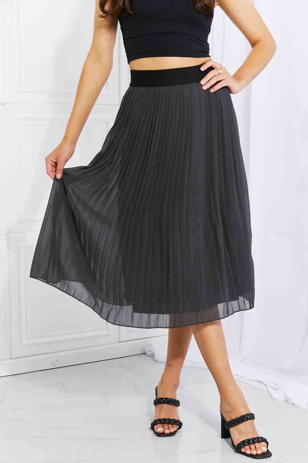 For all the romantics at heart: a pleated chiffon overlay flares out and hits at mid-calf, creating a fanciful yet chic ambiance on this midi skirt. The elastic waist pulls right on to simplify your morning, provide a comfortable fit, and to accomodate your body throughout the phases of the day. Opt for mules and a sleeveless bodysuit for summertime, or style with tall boots and a sweater for colder months.